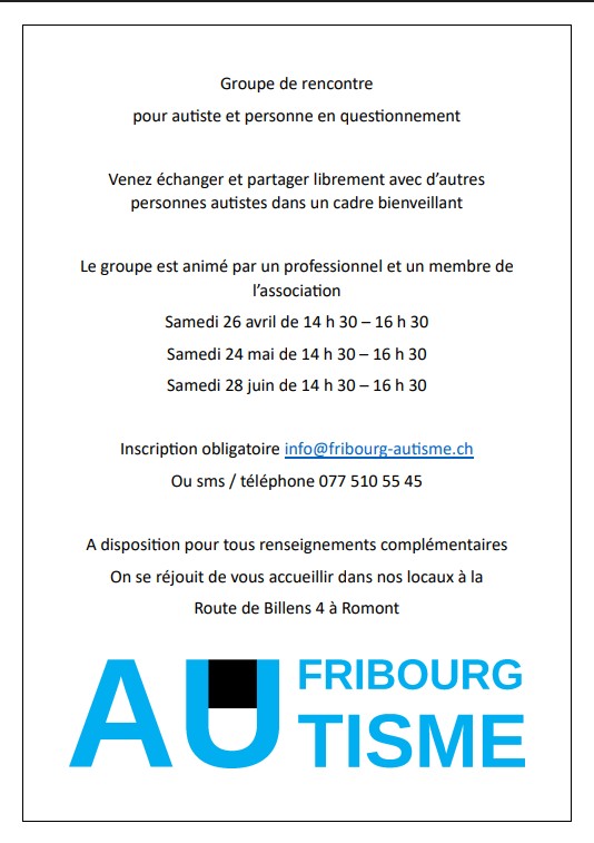 Merci de vous inscrire avant le vendredi précédent la rencontre en utilisant l’email de contact de Autisme Fribourg: groupe-fribourg@autisme.ch